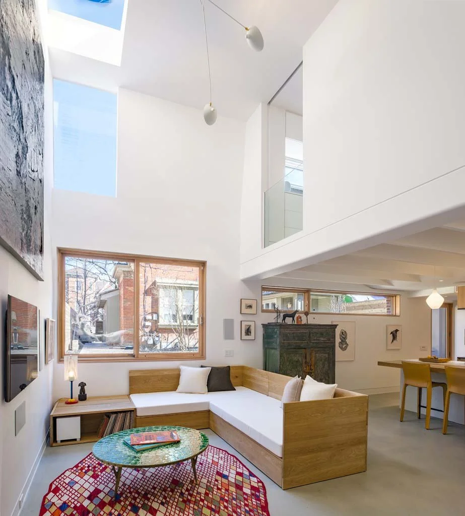 In reimagining this former carriage house, we excavated nearly a metre below grade to expand the interior volume within the narrow laneway lot. This strategic move allowed for generous ceiling heights on the main level and made room for a 480-square-foot open-plan kitchen and living area at the heart of the home. The lowered floor introduced a new spatial dynamic—angular, prismatic rooms are now bathed in natural light from skylights and continuous clerestory windows, bringing brightness deep into the interior.